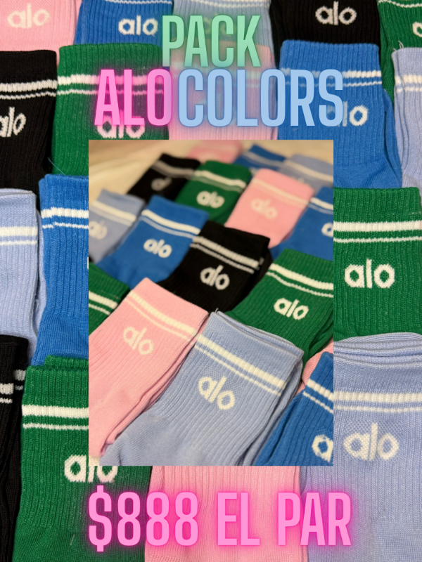 12 pares de medias tenis en colores surtidos y vibrantes (verde, rosa, celeste, azul, negro) con diseño Alo.