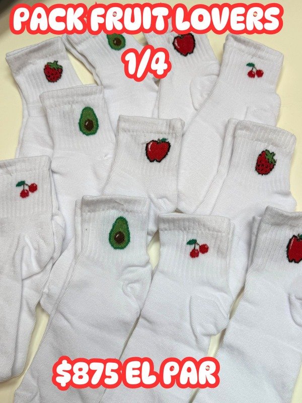 Un pack fresco, divertido y súper vendible. Son 12 pares de medias 1/4 blancas con diseños de frutitas que enamoran: