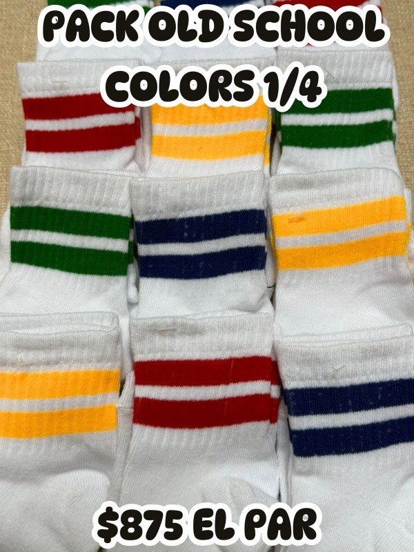Un pack pensado para esos clientes que aman el estilo retro, deportivo y súper combinable. Estas medias 1/4 de caña llegan con la mítica base blanca y líneas de colores fuertes: rojo, azul, verde y amarillo, creando ese look vintage que siempre se vende.